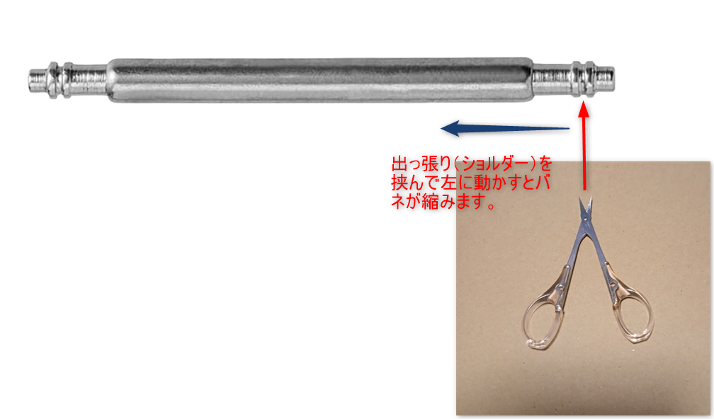ベルトはバネ棒で固定されています。下図のようにバネ棒の出っ張り(ショルダー)部に専用工具(私は鼻毛切バサミで代用)などで、ひっかけて左方向に押すとバネが縮まるので、その状態でバンドをずらすと外れます。
