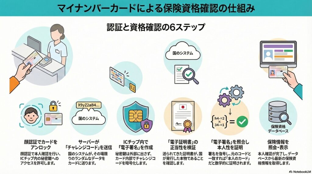 ここからは、病院の窓口でマイナンバーカードを使ったときに、 裏側でどんな処理が行われているのか を、技術的なステップとともに解説します。
